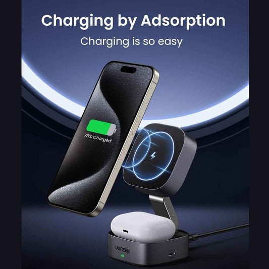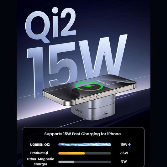 Ugreen Cargador MagSafe Inalámbrico 2 en 1 Qi2 15W Plegable Compacto para iPhone 12 al 17 y AirPods