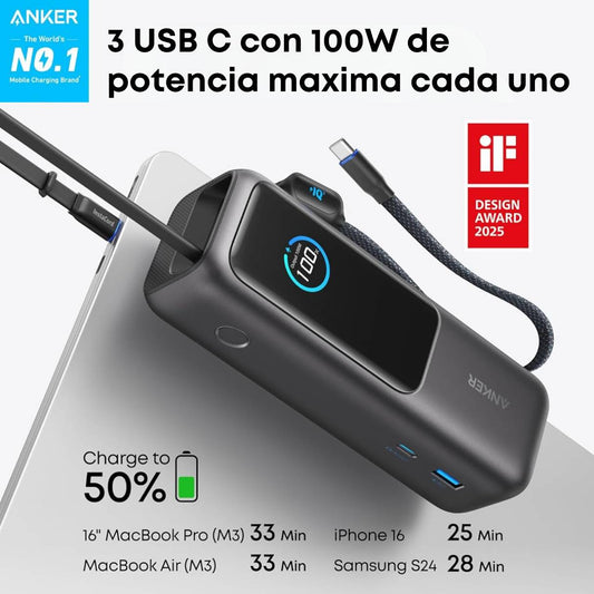 Anker Cargador Portátil de 25000 mAh de 165W, 2 cables integrados tipo C y retráctiles + 1C y 1USBA