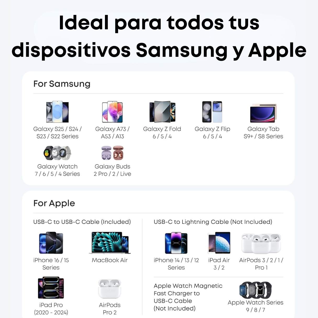 Admite una amplia gama de dispositivos, desde Samsung hasta Apple, proporcionando una fuente de alimentación confiable para todas sus necesidades de carga.