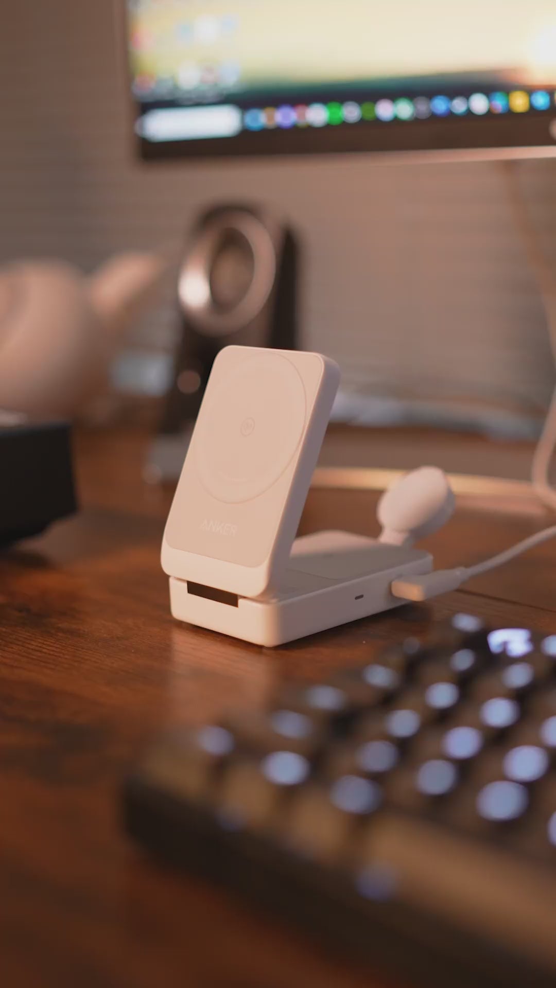 Carga tu iPhone, AirPods y Apple Watch simultáneamente, todo mientras disfrutas de la versatilidad del soporte ajustable incorporado. (Nota: Para una carga óptima, utilice el cargador de pared USB-C PD de 40 W proporcionado)