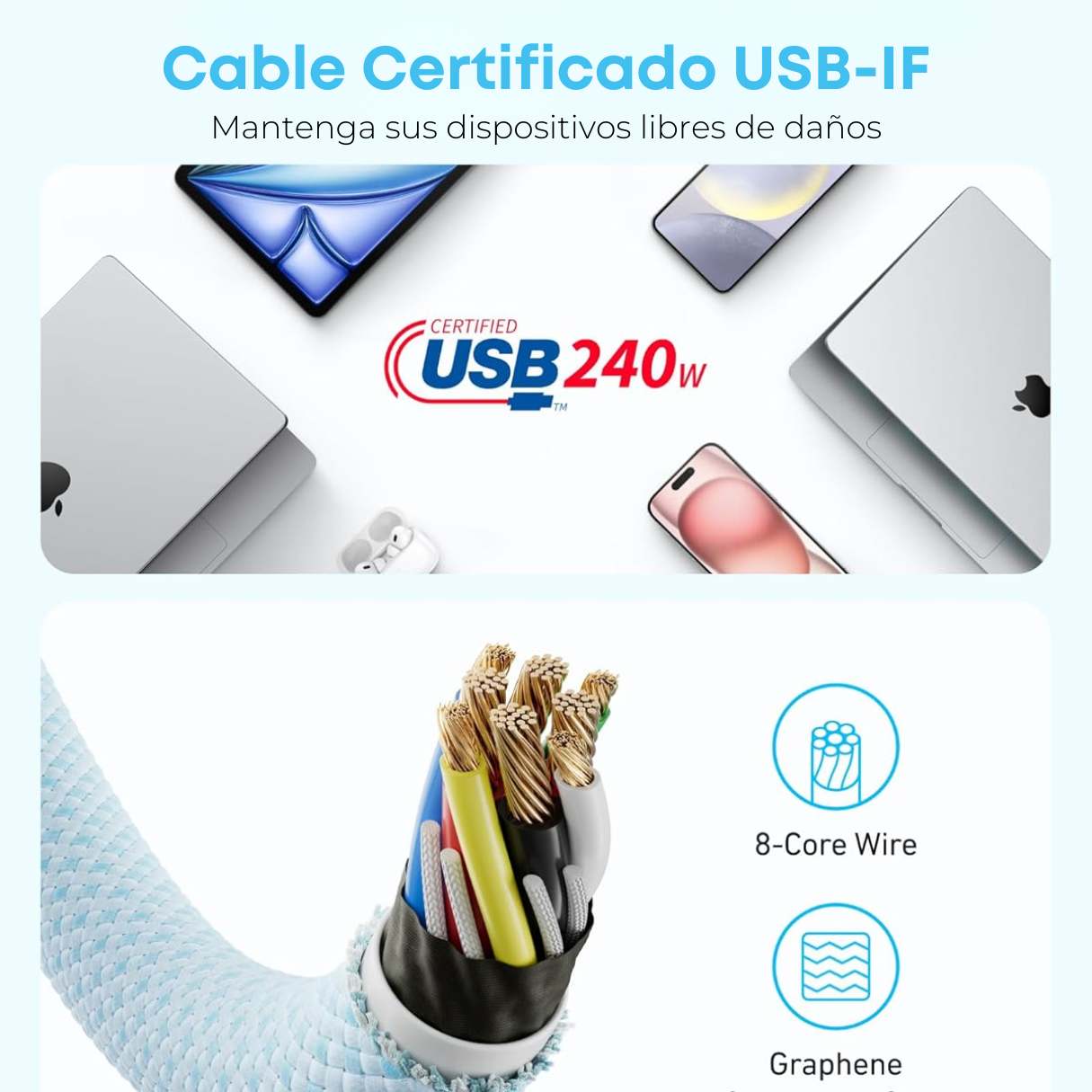 Anker Zolo - Cable tipo C a C, trenzado y repelente a la suciedad, carga rápida 240W 0.9M