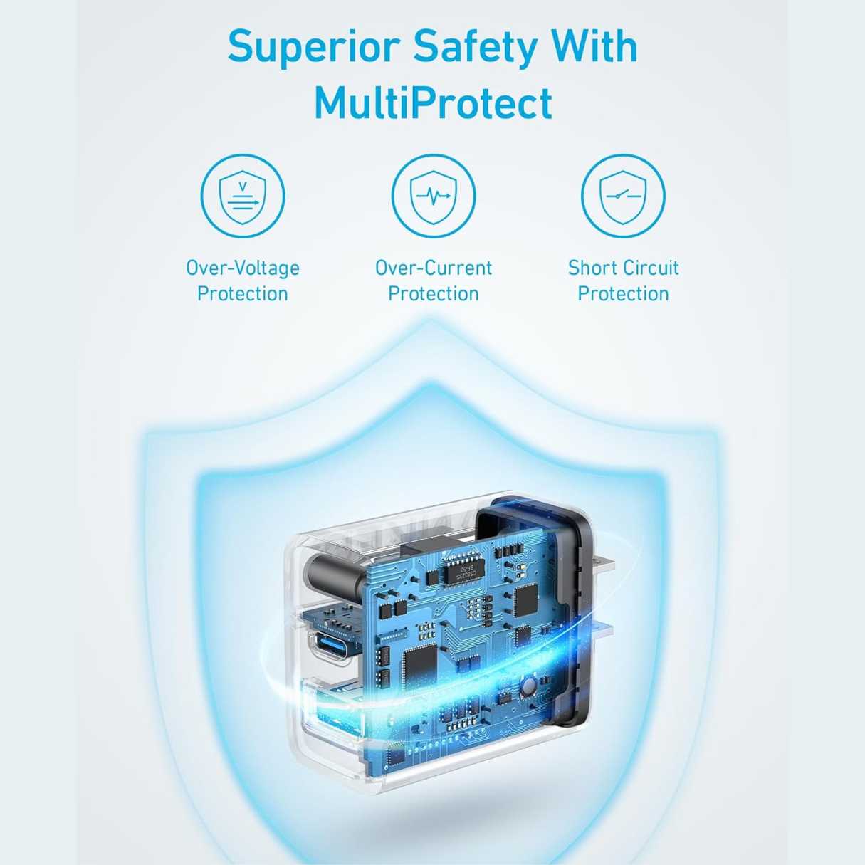 Descanse tranquilo sabiendo que el sistema de seguridad MultiProtect de Anker ofrece una protección integral para sus dispositivos, lo que le brinda tranquilidad mientras se carga.