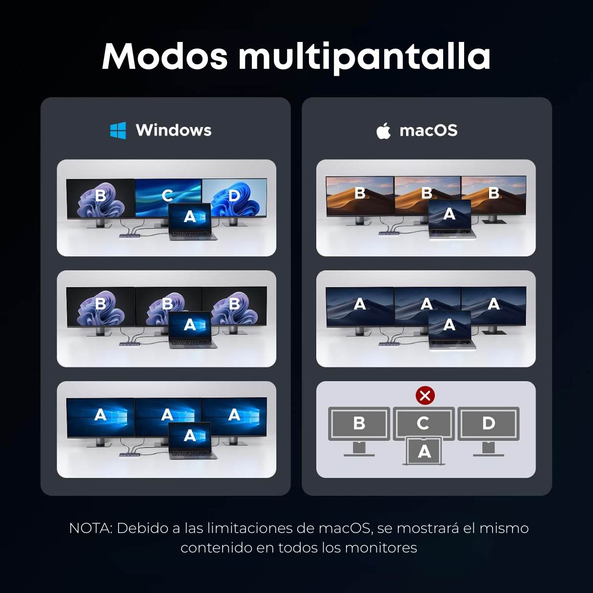 Este Hub triple 4K incluye 2 puertos HDMI, 1 puerto DP, puertos USB C 3.2 de 210G, puertos de datos 2USB A 2.0, lector de tarjetas SD/TF, carga PD de 100 W y un conector de audio de3.5m, que ofrece una solución de conectividad completa.
