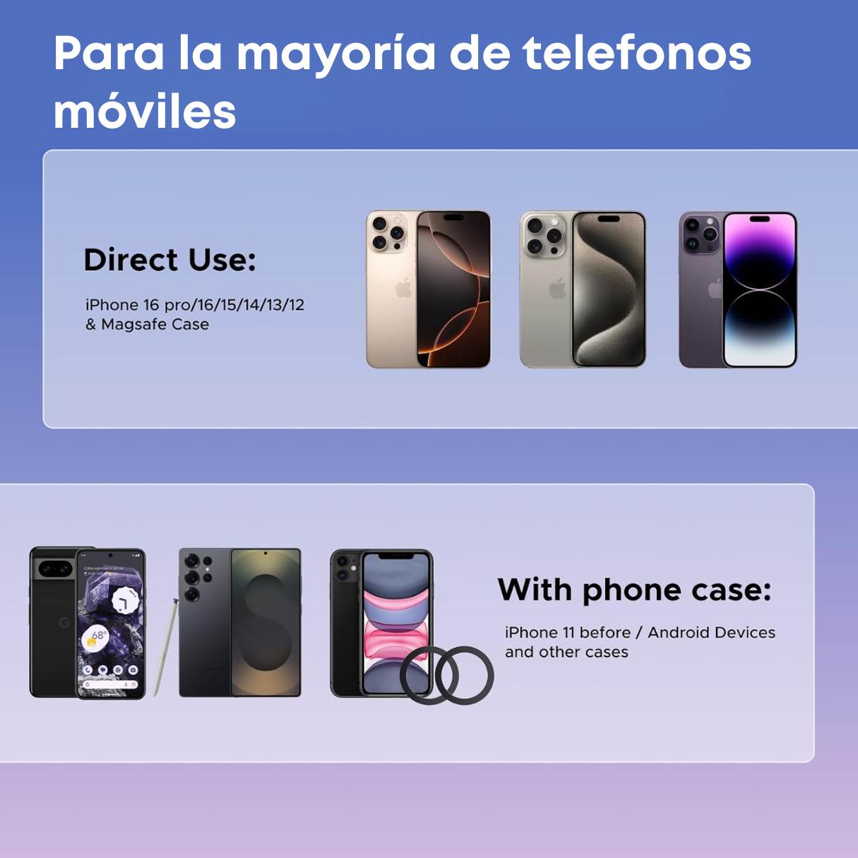 El soporte de teléfono para automóvil es directamente compatible con iPhone series 17 16 15 14 13 12 smartphone y funda original oficial MagSafe. Con 2 anillos de metal adicionales, también puedes utilizar el soporte de coche para iPhone con otros teléfonos Android